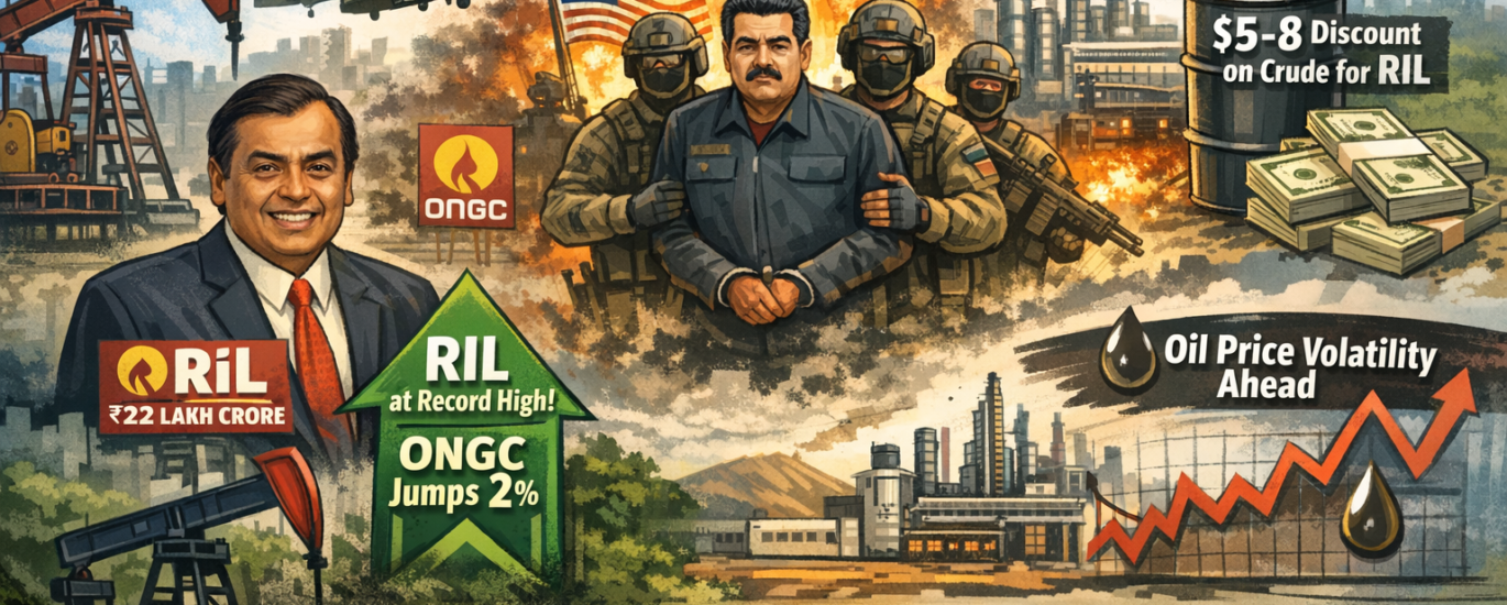 Indian stock markets witnessed strong action in oil and energy stocks as Reliance Industries (RIL) touched a record high, while ONGC surged nearly 2%, following dramatic geopolitical developments involving the United States and Venezuela. The rally was driven by expectations of changes in global crude supply dynamics and potential benefits for Indian oil companies.
